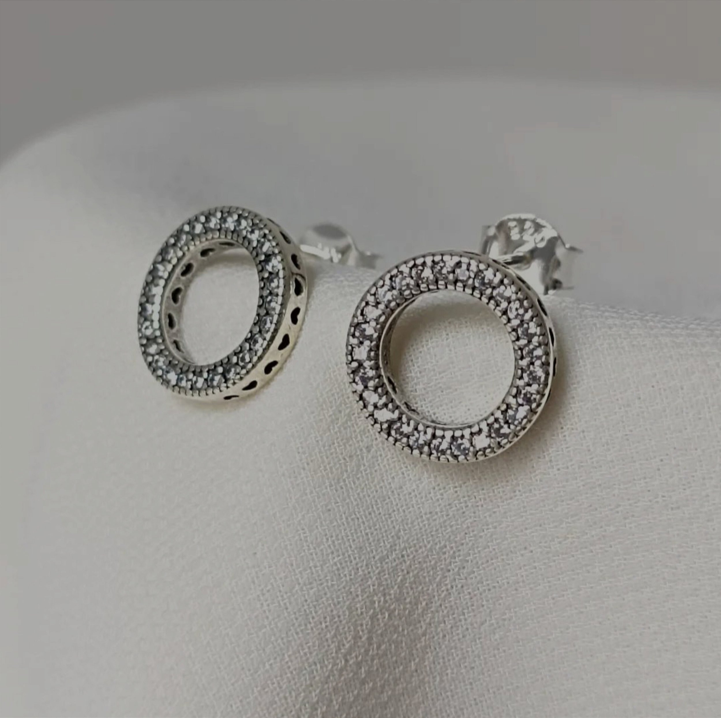 Brinco círculo vazado com pedras zircônias e detalhes de corações na lateral.