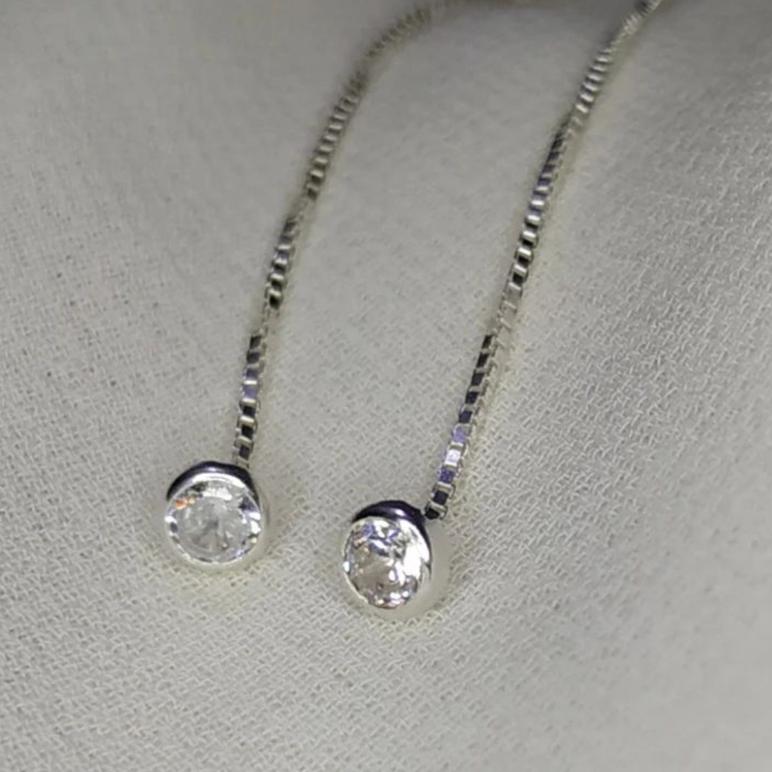 Brinco delicado com ponto de luz. A corrente fica pendente na parte de trás da orelha.